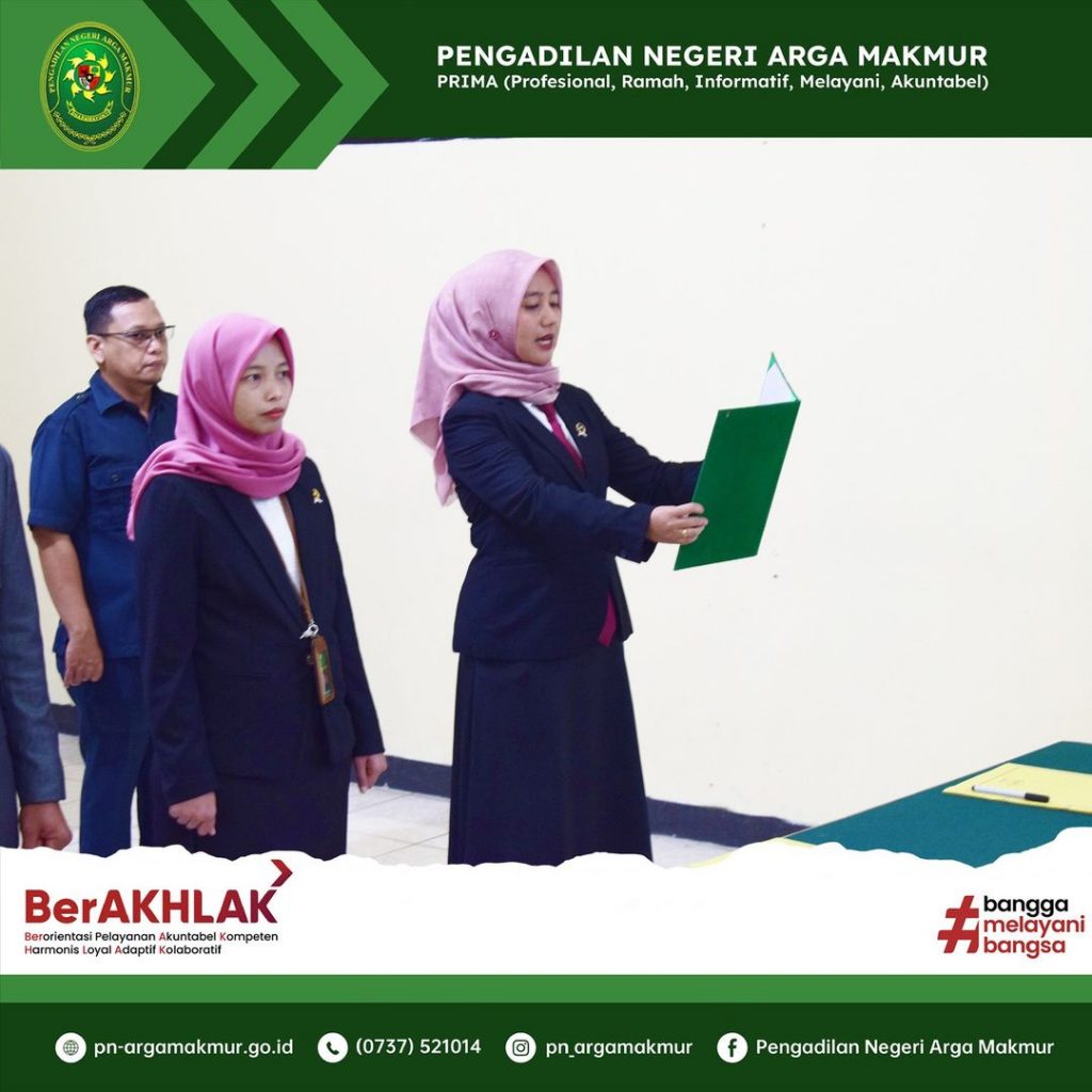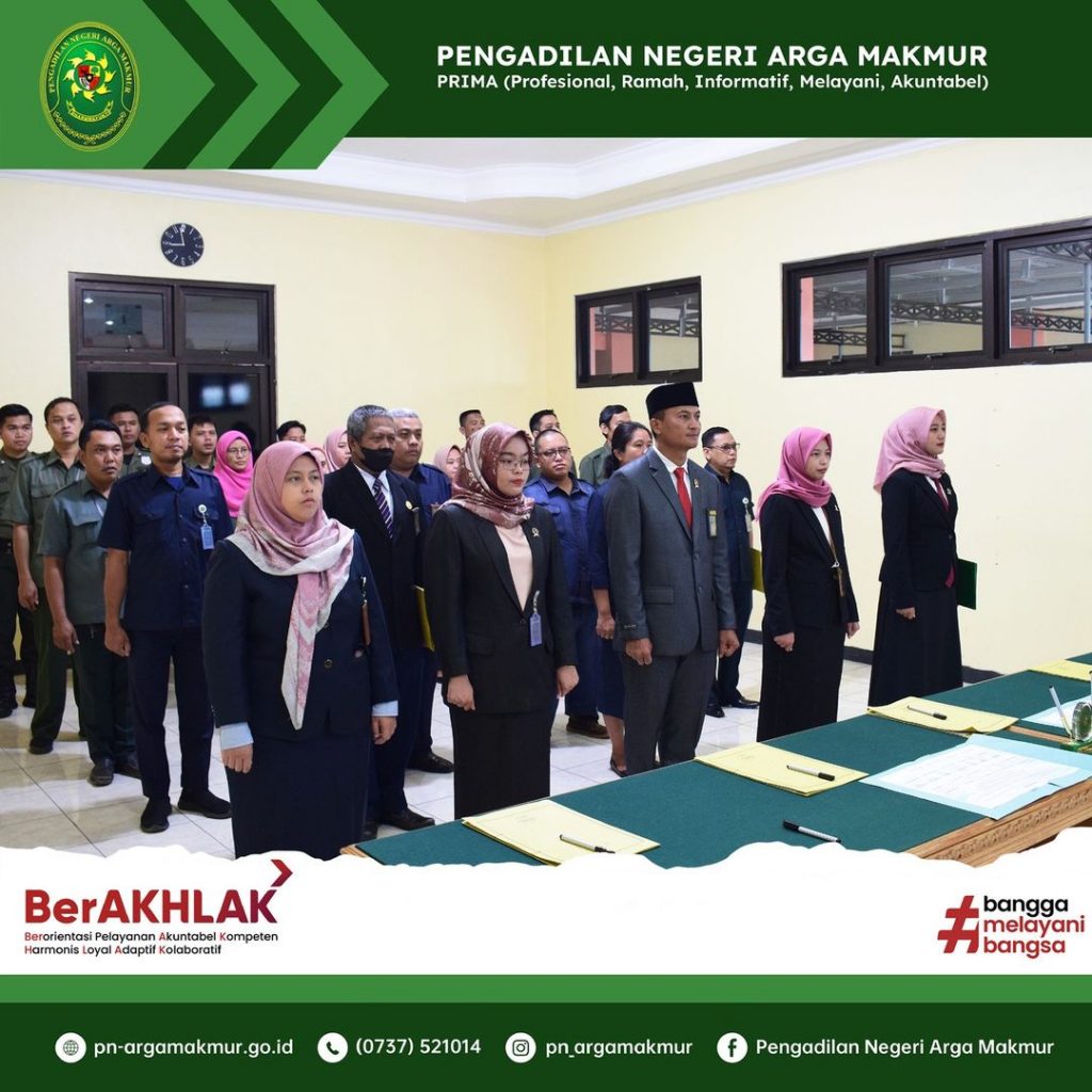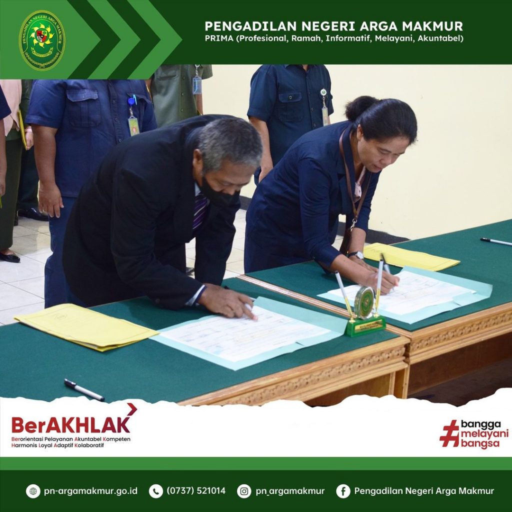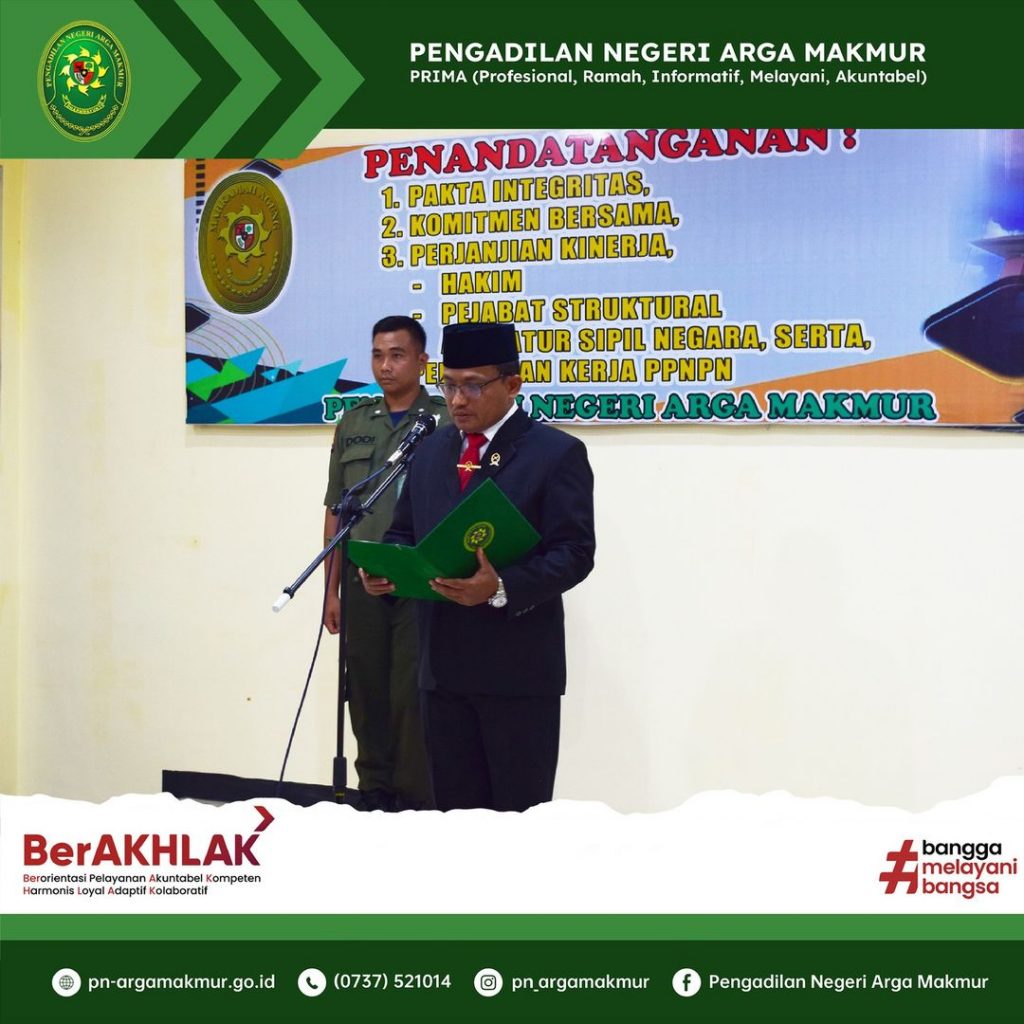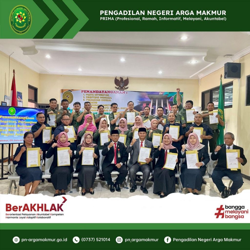 Arga Makmur – Selasa, 09 Januari 2024 pukul 09.00 WIB bertempat di Kantor Pengadilan Negeri Arga Makmur. Dilaksanakan Penandatanganan Pakta Integritas, Perjanjian Kinerja, Komitmen bersama dan Perjanjian Kerja PPNPN Pengadilan Negeri Arga Makmur. Kegiatan ini dipimpin Bapak Pangeran Hotma Hio Patra Sianipar, S.H.,M.H. selaku Ketua Pengadilan Negeri Arga Makmur, diikuti Wakil Ketua, para Hakim, pejabat Kepaniteraan, pejabat Kesekretariatan, para ASN dan PPNPN Pengadilan Negeri Arga Makmur. Kegiatan ini bertujuan untuk menekankan agar para Hakim, ASN, dan PPNPN Pengadilan Negeri Arga Makmur menolak tindakan KKN (korupsi, kolusi, dan nepotisme). (ShilviaJansi)