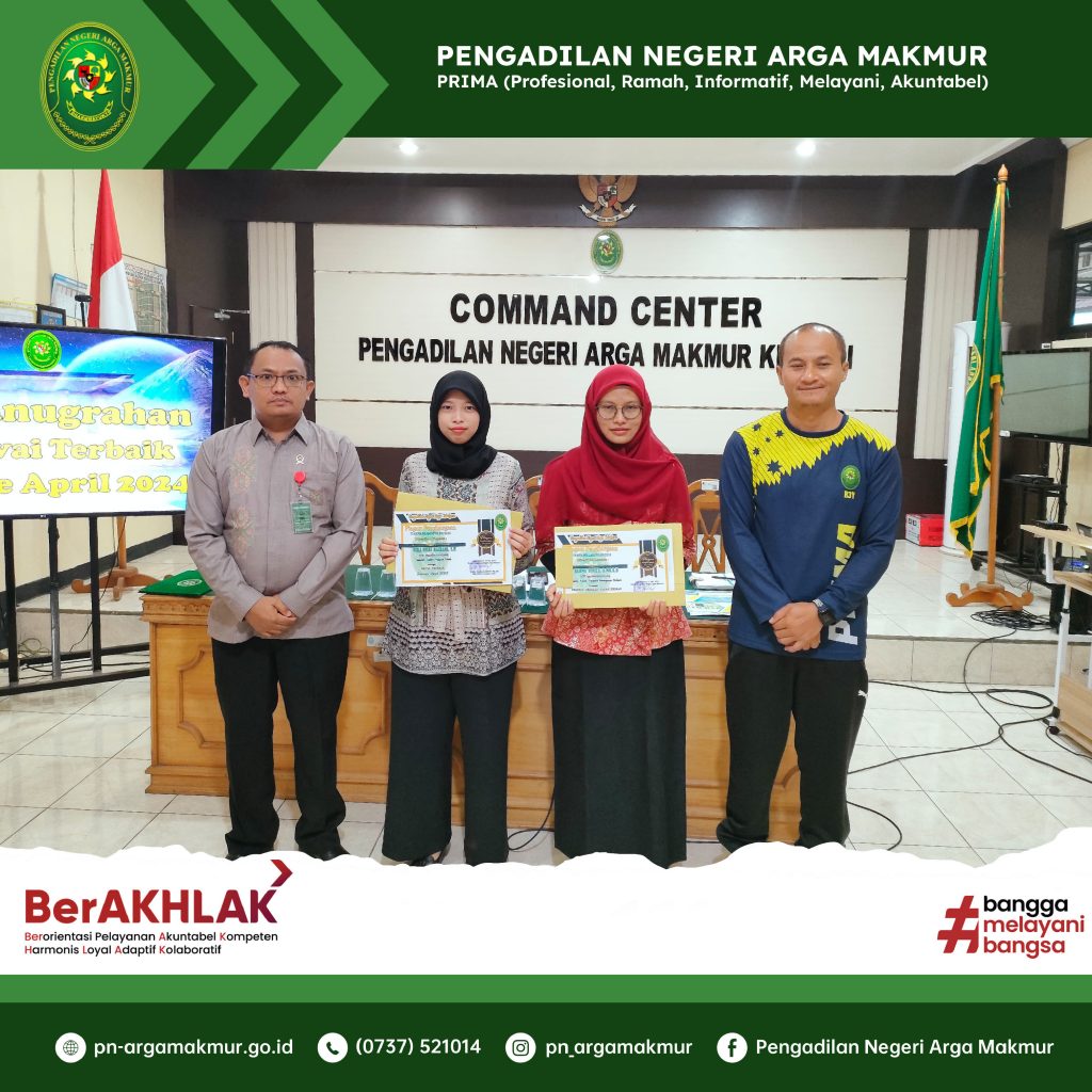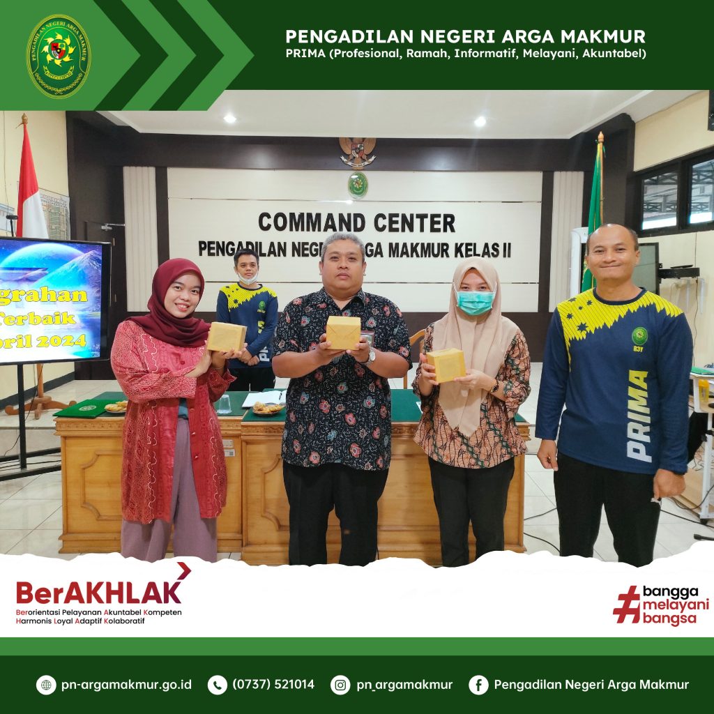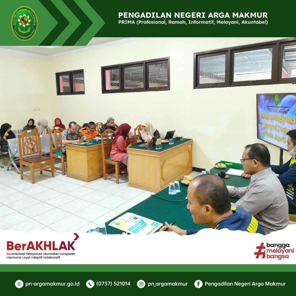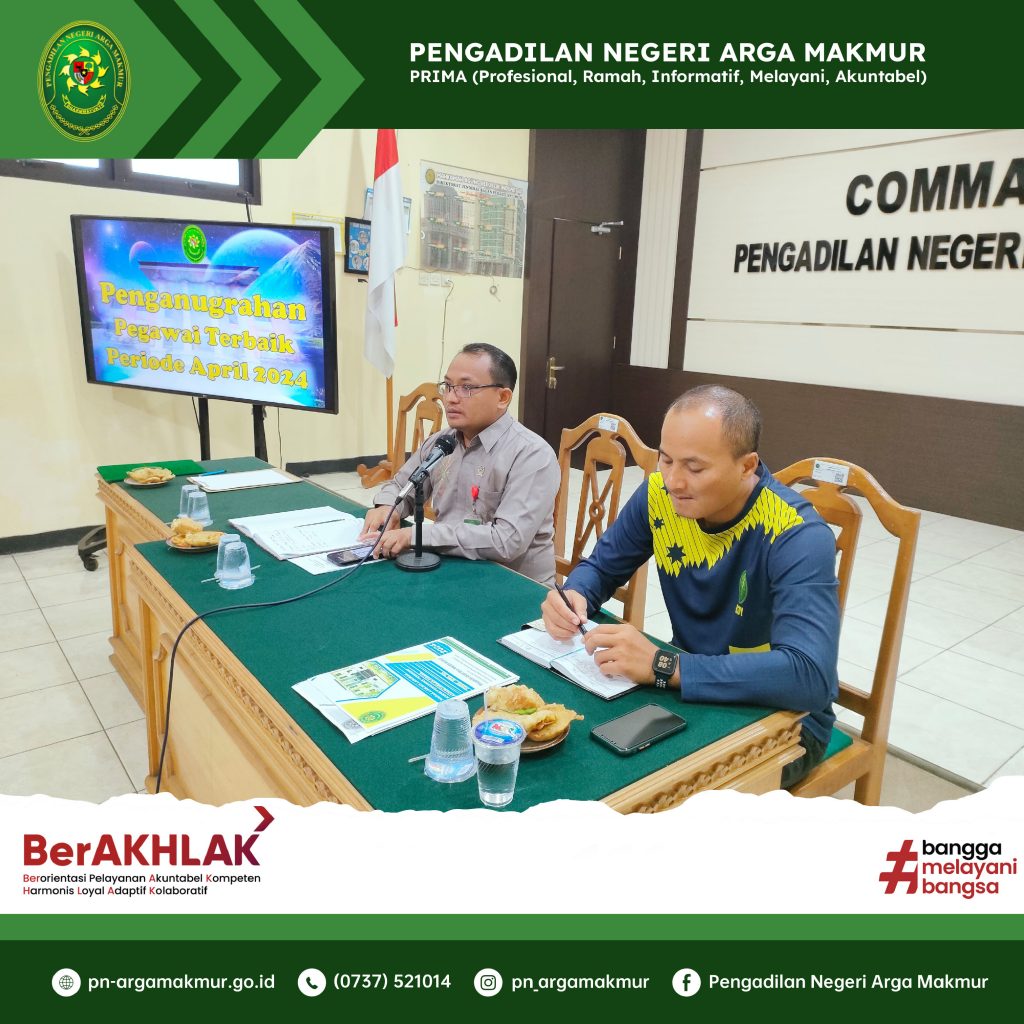 Sebagai upaya optimalisasi pelayanan publik serta monitoring dan evaluasi pelaksanaan tugas dan fungsi hakim, kepaniteraan, dan kesekretariatan, Jumat (03/05/2024) dilaksanakan Rapat Bulanan Periode Bulan April 2024 yang dihadiri oleh Ketua, Wakil Ketua, para Hakim, Panitera, Sekretaris, para Panitera Muda, para Kepala Sub Bagian, Jurusita, Jurusita Pengganti, serta para pelaksana ASN dan PPNPN di lingkungan Pengadilan Negeri Arga Makmur. Rapat yang dimulai sekira pukul 08.20 WIB bertempat di Ruang Command Center Pengadilan Negeri Arga Makmur. Pengawasan dipimpin oleh Wakil Ketua Pengadilan Negeri Arga Makmur, Kemas Reynald Mei, S.H., M.H., dan Pembinaan oleh Ketua Pengadilan Negeri Arga Makmur, Pangeran Hotma Hio Patra Sianipar, S.H., M.H. Pada kesempatan rapat kali ini juga dilaksanakan penyerahan piagam penghargaan dan bingkisan kepada Hakim dan Aparatur Terbaik Periode Bulan April 2024. Berdasarkan hasil rapat Tim Reward and Punishment, Hakim Pratama Muda, Rika Rizki Hairani, S.H., sebagai Hakim Terbaik, Resmi Hermini, S.H., M.H., sebagai Aparatur Kesekretariatan Terbaik, dan Rahma Yunita, A.Md.A.B., sebagai Aparatur Kepaniteraan Terbaik. (aliwardana)